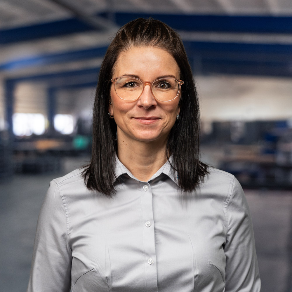 Eine Frau mit glattem dunklem Haar, die eine Brille und ein hellgraues Button-up-Hemd trägt, steht in einem großen Industrie- oder Lagerhaus und lächelt in die Kamera.