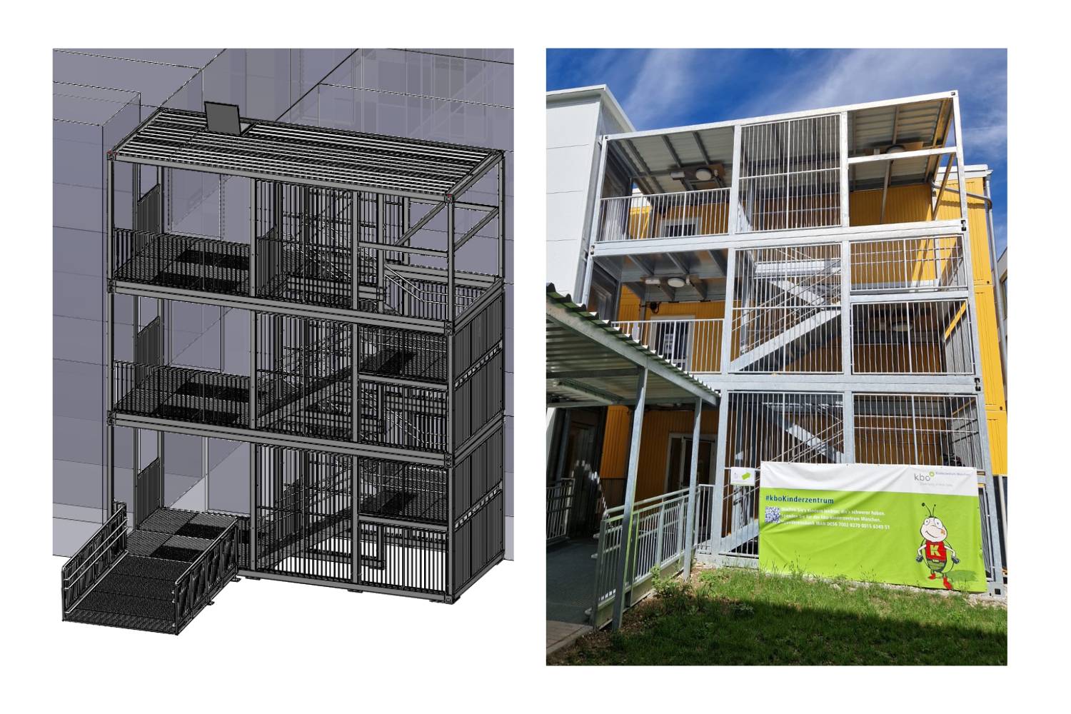 2-geschossige Containeranlage, Zugang ins 1. OG über eine Treppen- und Podestanlage, sowie Vordächer über den Eingängen, inkl. Planung und Statik (Fotos: BplusL)