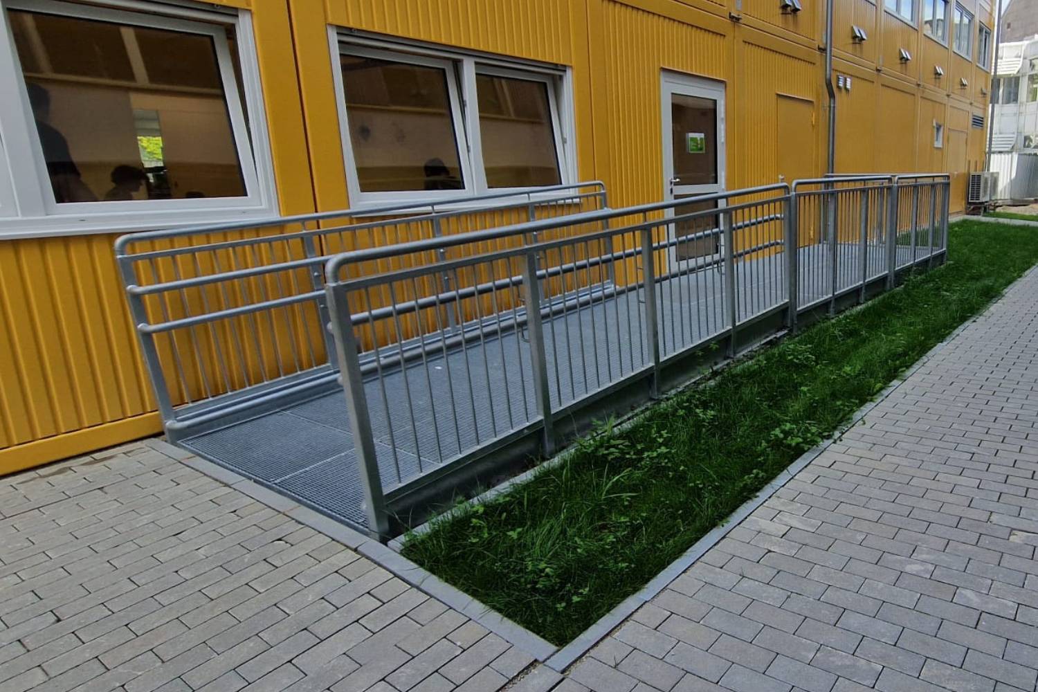 1-geschossiges Schulgebäude, 6 Eingänge über Podest-Rampen-System, inkl. Planung und Statik