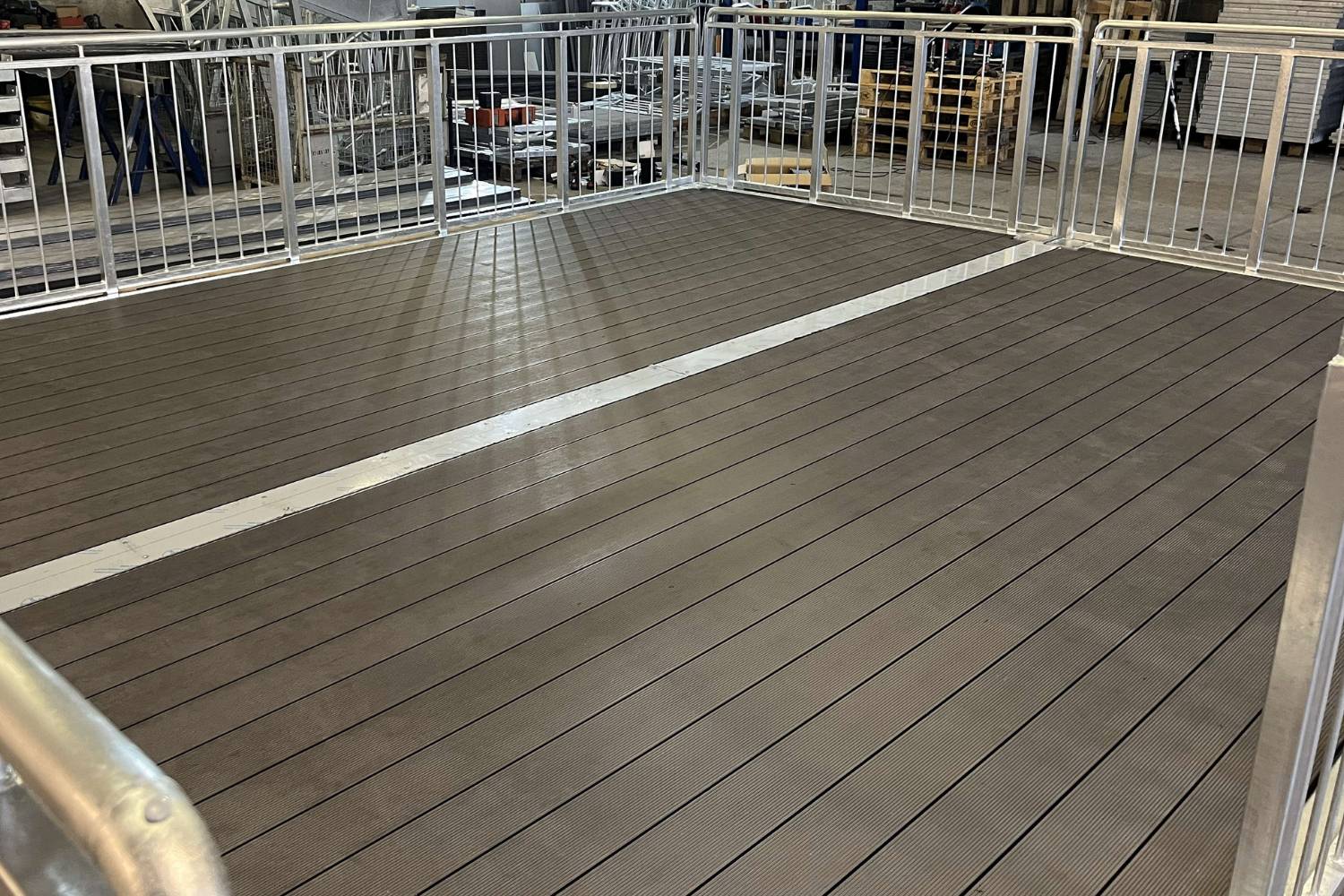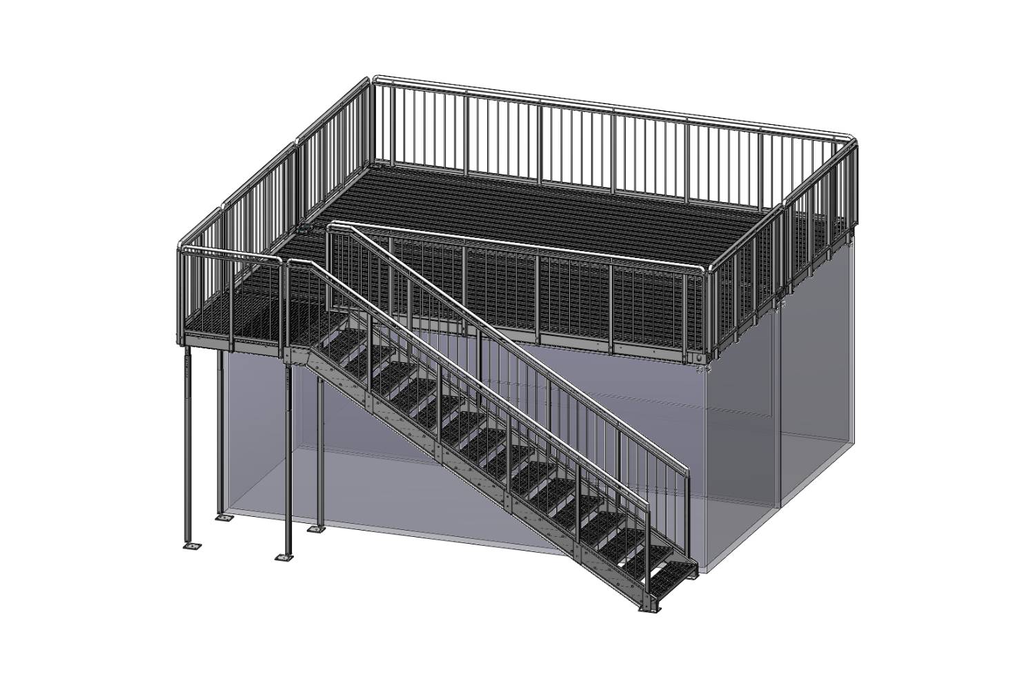 Zwei Containerterrassen aus je 2 Dachterrassen, Modultreppe mit Eckpodest und Podest-/Terrassengeländer